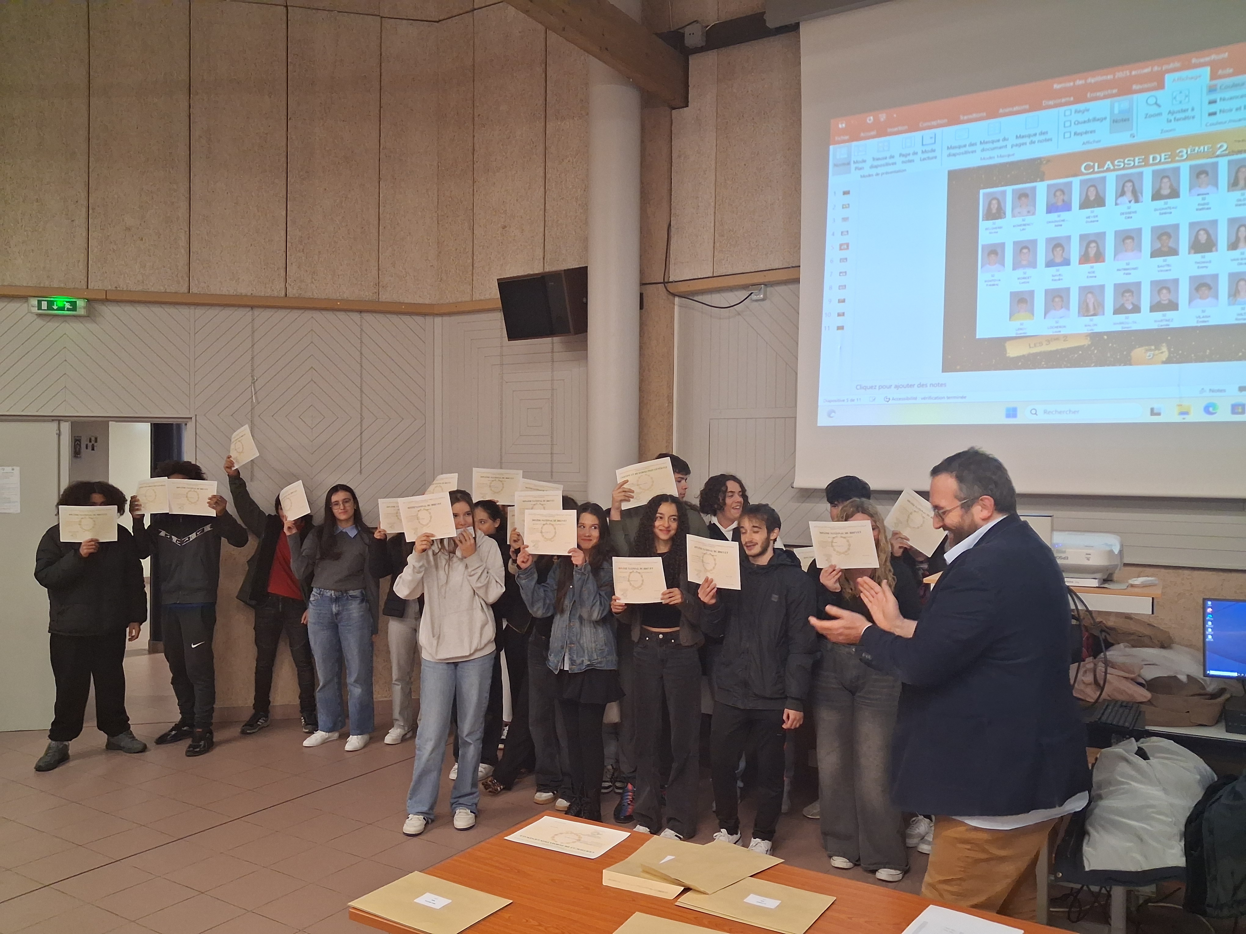 Le vendredi 21 novembre 2025 a eu lieu la remise des diplômes aux lauréats 2025 du brevet DNB et du certificat CFG . Après un discours de félicitations de madame La Principale Mme Madrange, les professeurs principaux de chaque classe ont remis les diplômes à leurs anciens élèves.