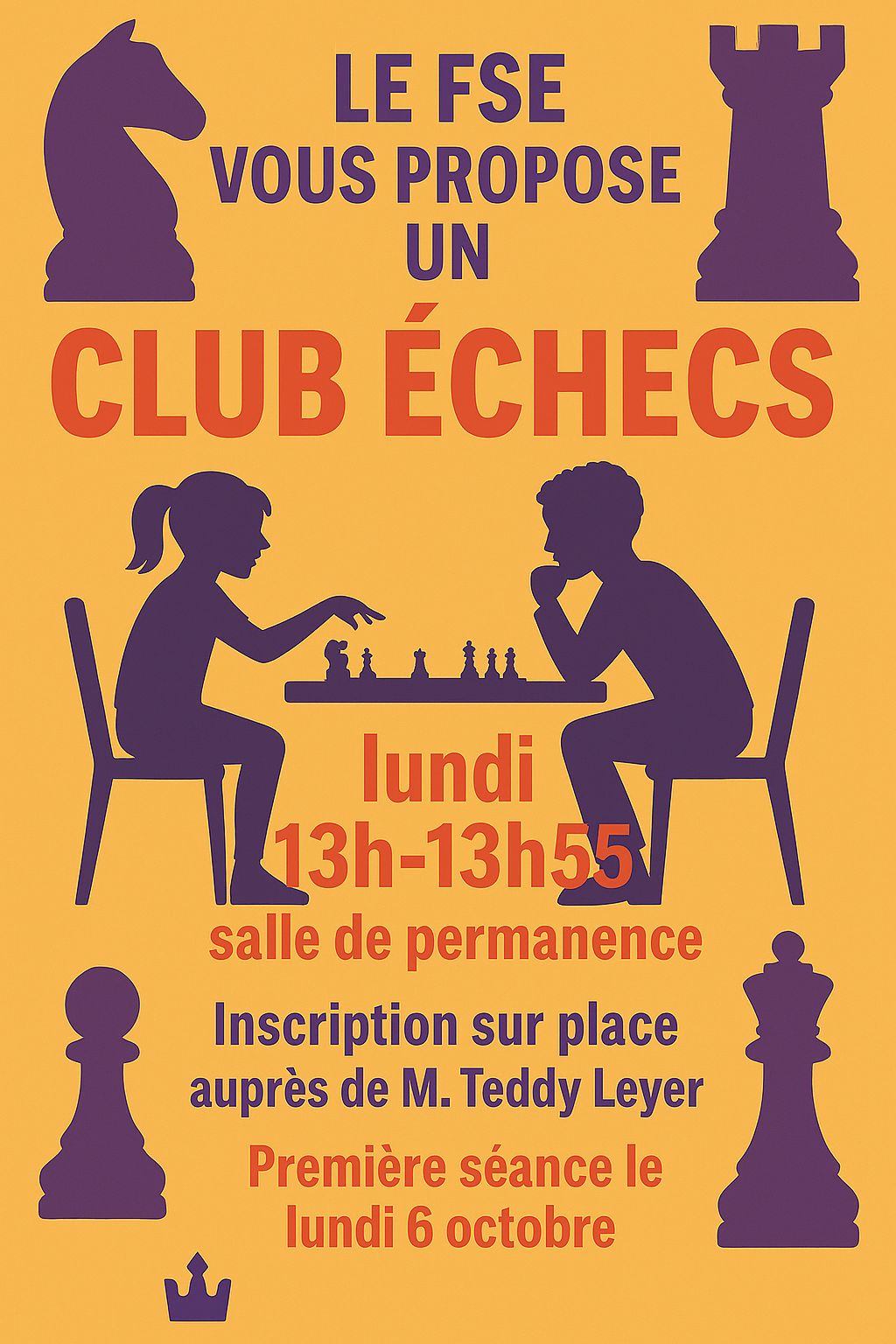 Dans le cadre des activités proposées sur le temps méridien, le FSE ouvre un atelier créatif, qui viendra s’ajouter aux ateliers déjà existants : atelier échecs et atelier théâtre. Un atelier jeux de société devrait également voir le jour prochainement. Nous comptons sur la participation des élèves pour faire de ce projet un moment riche en découvertes et en échanges.